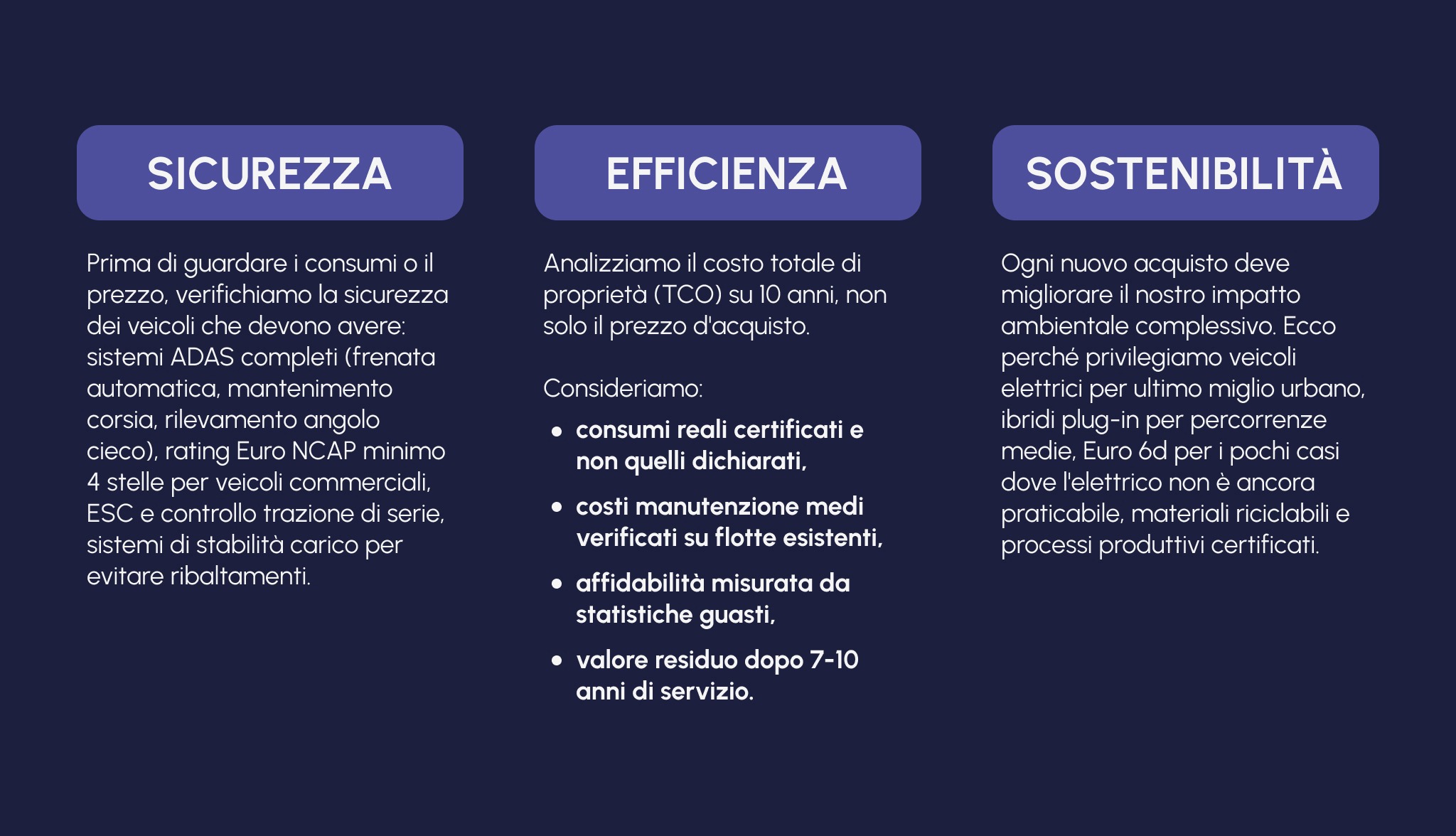 La nostra flotta non è una collezione di veicoli ma uno strumento fondamentale di servizio. Ogni scelta di acquisto impatta sulla sicurezza dei conducenti, sulla qualità delle consegne, sull’impatto ambientale e sui costi operativi.