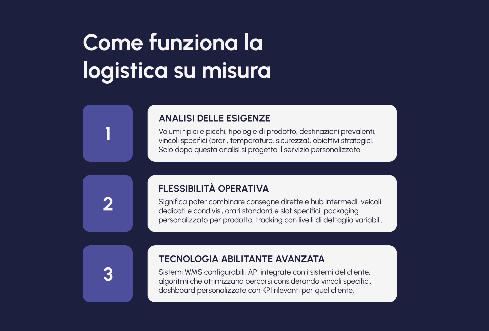 Per decenni la logistica ha operato con servizi standardizzati e pacchetti predefiniti (consegna standard, express, economy) che tutti dovevano adattare alle proprie necessità. Ma oggi le esigenze di un e-commerce di moda sono radicalmente diverse da quelle di un'azienda farmaceutica. Un B2B industriale ha ritmi opposti a un retailer alimentare.